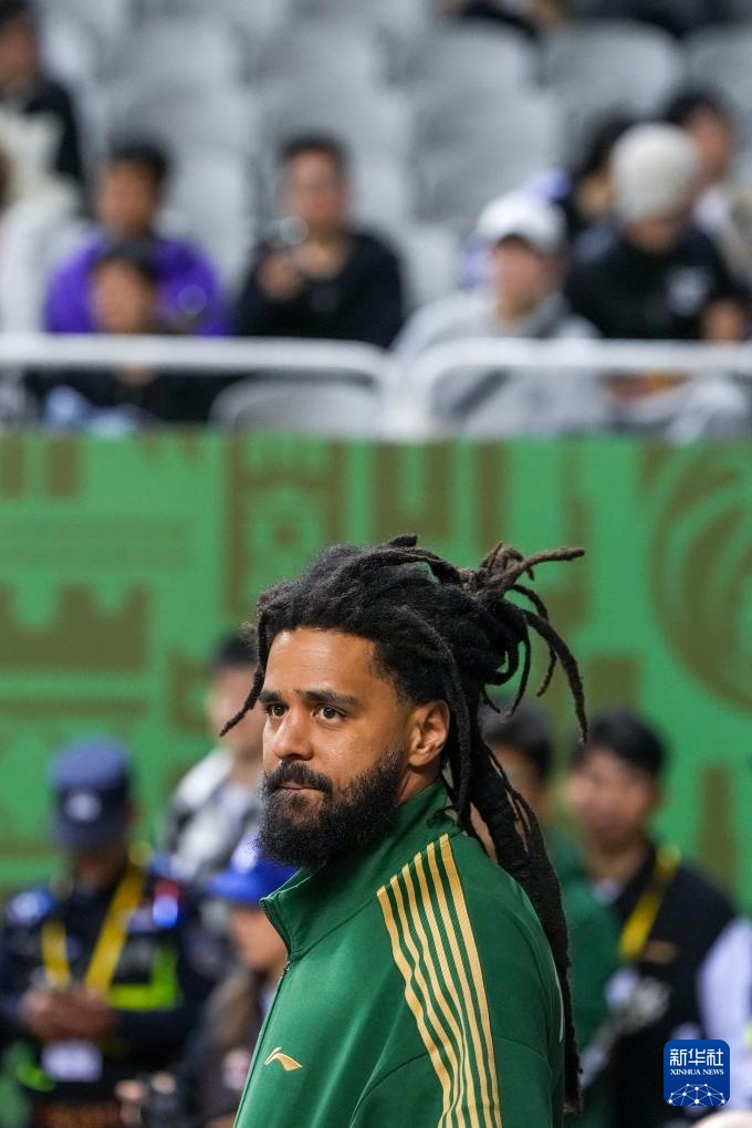 4月8日,跨界加盟南京同曦俱乐部的美国说唱歌手杰曼·拉马尔·科尔在场边观赛。新华社记者 李博 摄