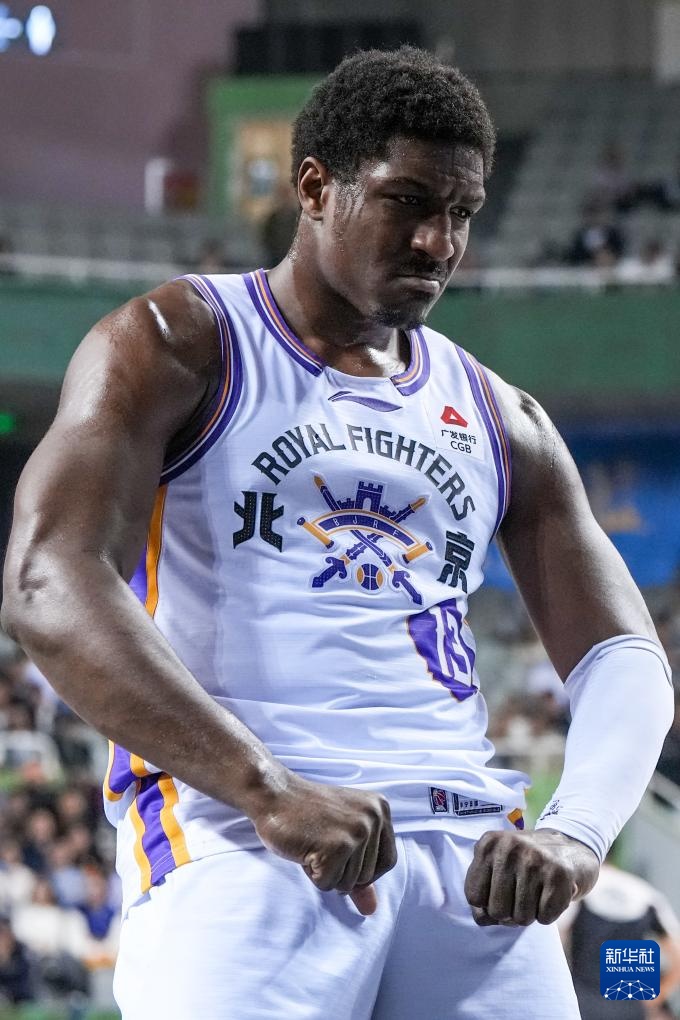 4月8日,北京控股队球员佩里在比赛中庆祝得分。新华社记者 李博 摄