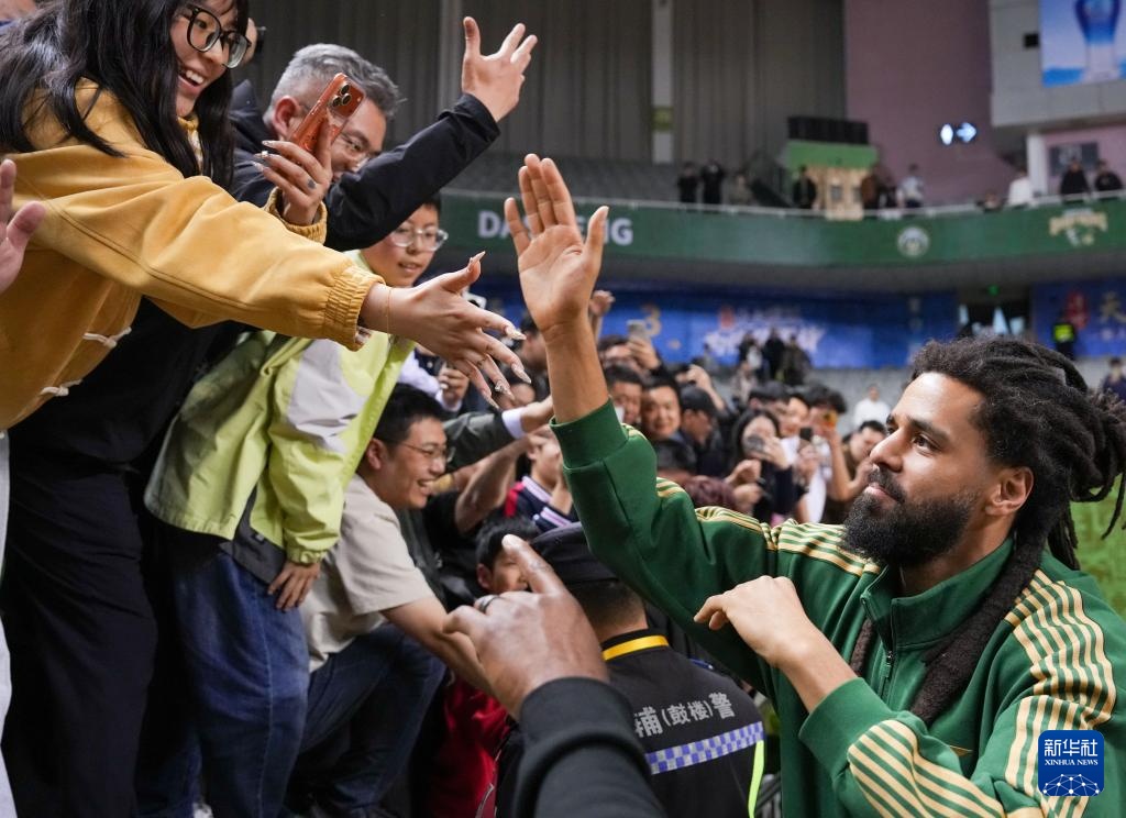 4月8日,跨界加盟南京同曦俱乐部的美国说唱歌手杰曼·拉马尔·科尔(右一)赛后与球迷互动。新华社记者 李博 摄